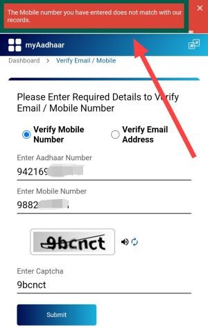 2. अब आपको सामने ही एक लाल रंग के पॉप आइकन में यह जानकारी दी जाएगी कि आपके आधार कार्ड के साथ वह मोबाइल नंबर जुड़ा हुआ है या नहीं!