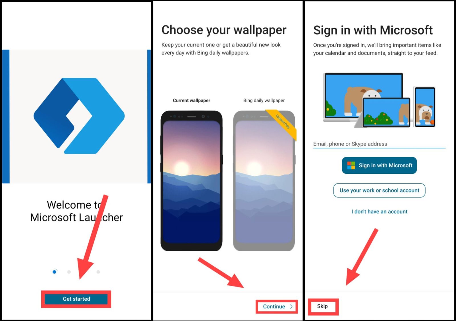 2. ऐप खोलने के बाद Get Started पर टैप करें, फिर Continue पर क्लिक करें। चाहें तो Microsoft अकाउंट से लॉगिन करें या Skip करें।