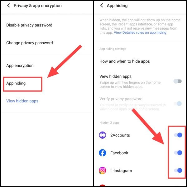 6. App Hiding Settings में जाएं और इन दो विकल्पों को ऑन करें: View Hidden Apps, Verify Privacy Password