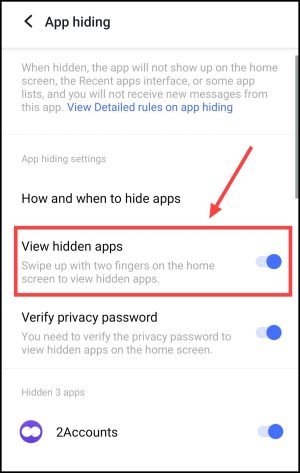 इन फीचर्स को ऑन करने के बाद आप हिडन ऐप्स को एक्सेस करने के लिए अपने फोन की होम स्क्रीन पर दो उंगलियों से ऊपर की ओर स्वाइप करें (two-finger swipe up gesture)। फिर आपको वही हिडन ऐप्स दिखेंगी, जिन्हें आप अपने सेट किए गए पासवर्ड से खोल सकते हैं।