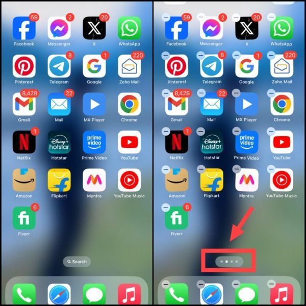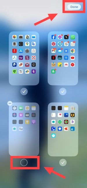 2. अब स्क्रीन पर नीचे की तरफ दिए गए Page Dots (छोटे गोल बिंदु) पर टैप करें। ये आपको iPhone के सभी पेज दिखाएंगे।