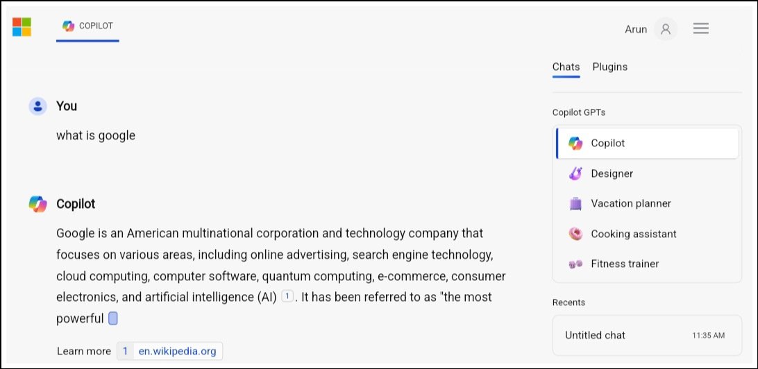 यह माइक्रोसॉफ्ट का एक AI Tool है जोकि Bing सर्च इंजन के साथ कार्य करता है। अर्थात यह टूल वेब सर्च रिजल्ट के आधार पर आंसर जेनरेट करता है। यह माइक्रोस्फोट के सभी पॉपुलर टूल जैसे एक्सेल, पावरप्वाइंट, Word इत्यादि को आटोमेशन के जरिए सपोर्ट करता है।