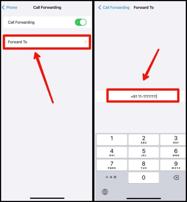 4. अब Forward To पर टैप करें और उस नंबर को दर्ज करें जिस पर आप इनकमिंग कॉल्स को फॉरवर्ड करना चाहते हैं। इसके बाद बैक आ जाएं।