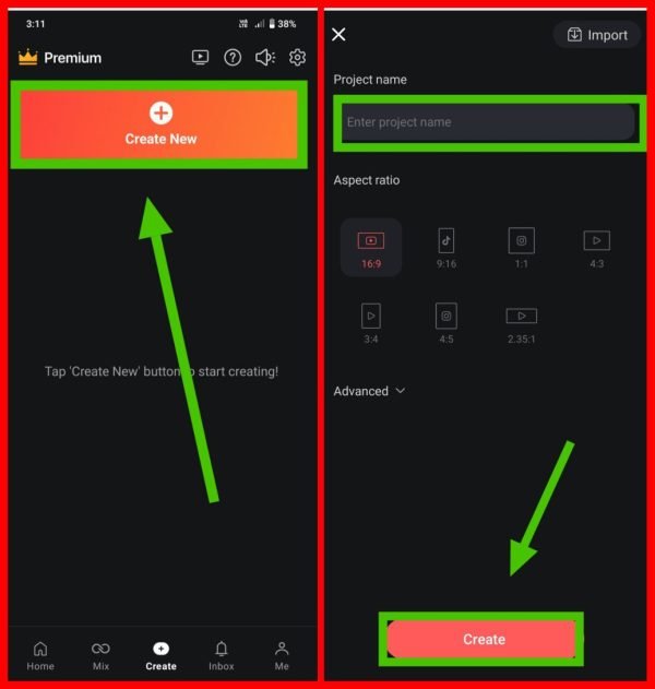 (b) अब डाउनलोड होने के बाद इसे ओपन करें। इसके बाद Create New पर क्लिक करें। फिर अब Project Name डालें ओर Aspect Ratio 16:9 सेलेक्ट करें और Create पर क्लिक करें।